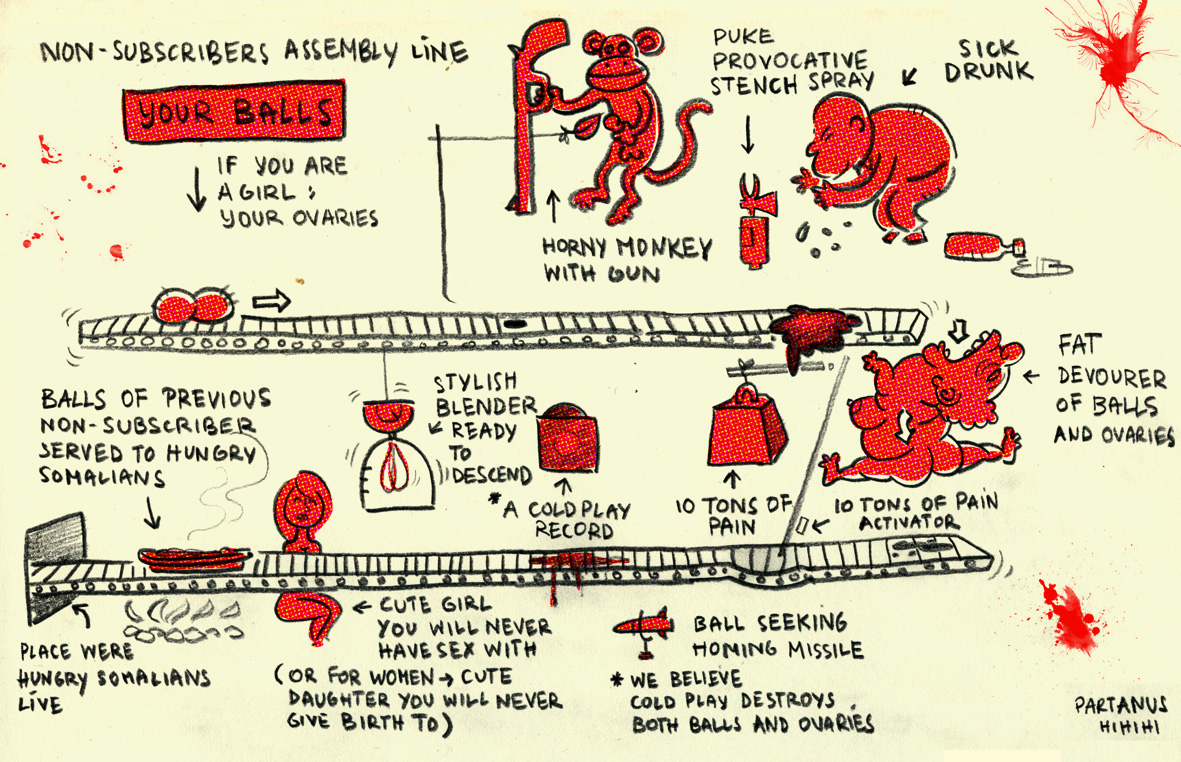 What happens to people who don’t subscribe to the Partanus blog? Posted byPartoonJune 14, 2011November 30, 2011Posted inCheese, Copulaties, Copulations, Excrements, Gruwel, Horror, Kaas, Nodeloos geweld, Omwentelingen, Revolutionaire ideeën, Revolutionary ideas, Senseless violence, Sudden changes, UitwerpselenTags:cartoon, cold play, horny monkey, subscribe, testicles, torture Make it easy for yourself…subscribe! Use the subscribe button on the right… Rate this:Share this: Click to share on Facebook (Opens in new window) Facebook Click to share on X (Opens in new window) X Like Loading... Related Published by Partoon Partoon does 2d and 3D animation, storyboards, comic books, cartoons, acts of madness, storytelling, anti-humor, anti-art, art, humor, drain View more posts