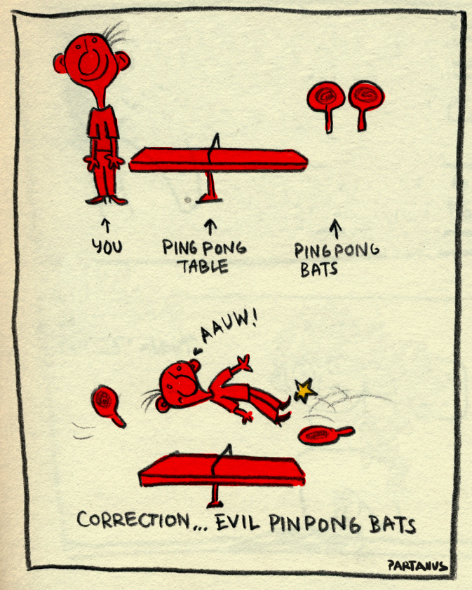 Ping pong Posted byPartoonJune 20, 2011October 3, 2011Posted inOmwentelingenTags:cartoon Rate this:Share this: Click to share on Facebook (Opens in new window) Facebook Click to share on X (Opens in new window) X Like Loading... Related Published by Partoon Partoon does 2d and 3D animation, storyboards, comic books, cartoons, acts of madness, storytelling, anti-humor, anti-art, art, humor, drain View more posts